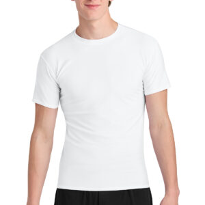 This compression tee offers 4-way stretch, moisture wicking and flatlock seams for ultimate comfort. 5-ounce, 80/20 polyester/spandex 4-way stretch Flatlock stitched seams Rash guard protection Moisture-wicking Odor resistant Stain release Tag-free label