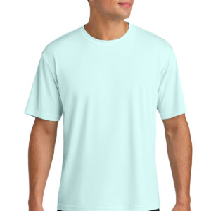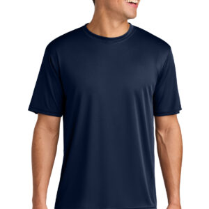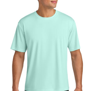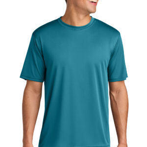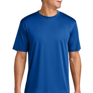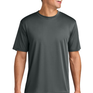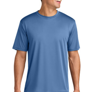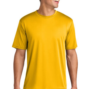 A top choice for sports and exercise, this tee combines a comfortable fit with performance features such as moisture wicking and sun protection. 4-ounce, 100% recycled poly interlock Moisture-wicking Stain release Odor-resistant Snag-resistant UPF rating of 44+ Reinforced shoulder seams for durability Double-needle coverstitching on hem Tag-free label
