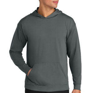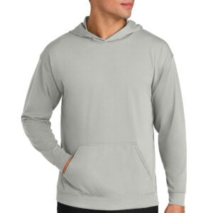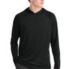 Balancing polyester performance with cotton comfort, this long sleeve hooded tee constructed from recycled materials has a rich, soft feel. 4.1-ounce, 65/35 recycled polyester/cotton Moisture-wicking Odor-resistant Stain-resistant Self-fabric hood, cuffs and hem Front pouch pocket Tear-away label