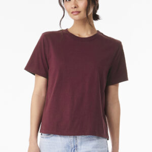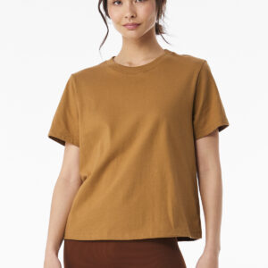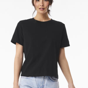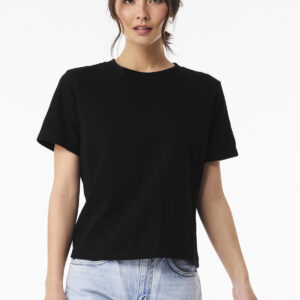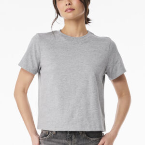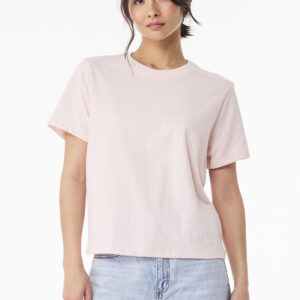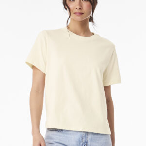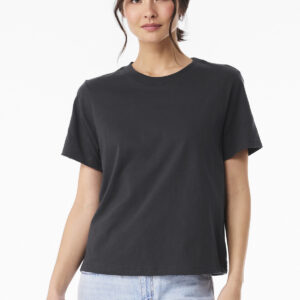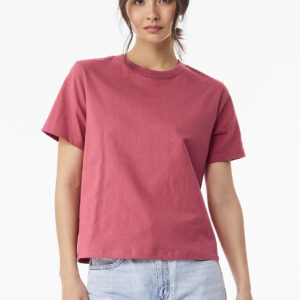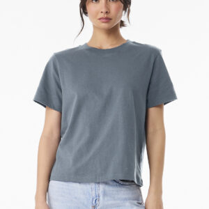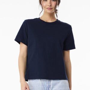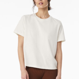 Boxy relaxed fit Double-stitched neck Set-in sleeve Side seamed Mid-length Tear-away label 6-ounce, 100% Airlume combed and ring spun cotton, 20 singles Athletic Heather: 90/10 Airlume combed and ring spun cotton/polyester