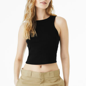 Stretch fit High neck Racerback 1×1 micro rib Side seamed Mid-length Tear-away label 5.4-ounce, 52/48 Airlume combed and ring spun cotton/polyester, 32 singles Athletic Heather: 90/10 Airlume combed and ring spun cotton/polyester