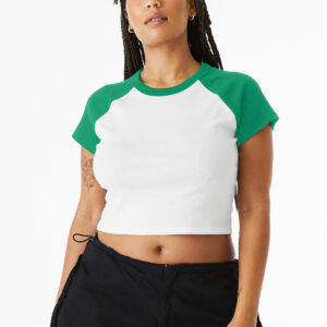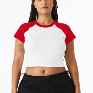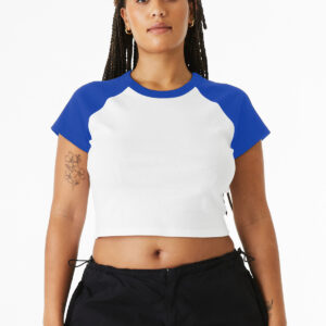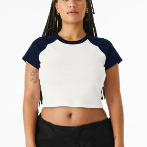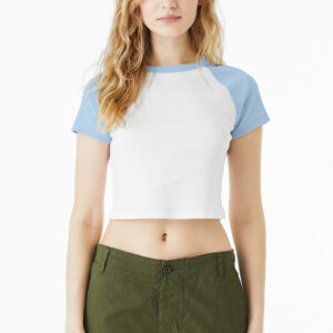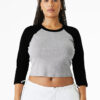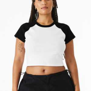 Stretch fit Crewneck binding Set-in cap sleeve 1×1 micro rib Side seamed Mid-length Tear-away label 5.4-ounce, 52/48 Airlume combed and ring spun cotton/polyester, 32 singles Athletic Heather/Black: 90/10 Airlume combed and ring spun cotton/polyester