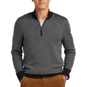 The perfect throw-on-and-go option for any event, this machine washable 1/4-zip sweater features natural Merino wool and an eye-catching birdseye pattern. 100% extra-fine Merino wool Machine washable for easy care Fully fashioned throughout 1×1 rib neck, cuffs and hem 1/4-zip cadet collar Antique silver zipper pull with Brooks Brothers logo