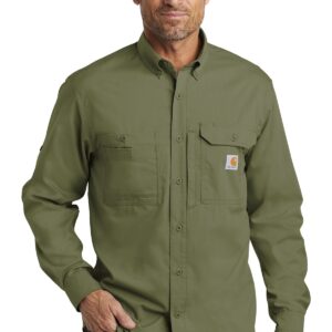 Don’t let the heat stop you from a long day outdoors. The Ridgefield wicks sweat, releases stains in the wash and has a mesh-lined back to keep you cool as a catfish. 3-ounce, 60/40 poly/cotton sheeting FastDry ® technology wicks away sweat Stain Breaker ® technology releases stains Double-layer collar converts to stand-up collar for extra sun protection Mesh-lined vent at center back for flow-through ventilation Articulated elbows Convertible roll sleeves with buttons Four chest pockets: Left has buttoned-flap pocket with an oversized, concealed, zippered, mesh-lined vertical pocket; Right has two easy-entry pockets: one with button closure, one with hook and loop closure Contrast color neck piping Carhartt label sewn on left chest pocket Carhartt Force ® labeling on inner back neck Relaxed fit