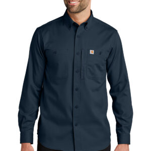 Clean and simple, this button-down work shirt can do it all. A triple-stitched, wrinkle-free design maintains a professional appearance, day in and day out. 5-ounce, 58/39/3 cotton/poly/spandex Rugged Flex ® durable stretch technology for ease of movement Button-down collar Two chest pockets with button closures Left chest map pocket with zipper closure Carhartt label sewn on left chest pocket Carhartt-strong, triple-stitched main seams Two-button adjustable cuffs Relaxed fit