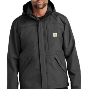 Our best-selling Shoreline Jacket has been updated. 7.3-ounce, 100% nylon oxford shell Storm Defender ® waterproof, breathable technology Wind Fighter ® technology tames wind 10K/10K waterproof/breathable protection rating Fully taped waterproof seams Polyester mesh lining Taffeta lining in sleeves and hood for easy on/off Adjustable, removable roll-away hood Full-zip front with inner and outer storm flaps Two interior pockets with hook and loop closures Left chest pocket with secure waterproof zipper and storm flap Two lower front pockets with zippered closures and storm flaps Adjustable cuffs with hook and loop closures and inner sleeve storm cuffs Adjustable drop tail hem Carhartt-strong, triple-stitched main seams Carhartt label sewn on chest pocket Loose fit