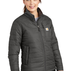 Keep working through cold, wet weather in this women’s version of our popular Gilliam Jacket. 1.75-ounce, 100% nylon Cordura ® shell Rain Defender ® durable water repellent Wind Fighter ® technology tames wind Nylon lining quilted to 100-gram, 100% polyester insulation for warmth Reverse coil center front zipper Zip-through collar Left chest map pocket with reverse coil zipper Two hand pockets with hidden snap closures Two interior pockets: one zippered, one hook and loop closure Hook and loop adjustable cuffs Drawcord adjustable drop tail hem Carhartt-strong, triple-stitched main seams Carhartt label sewn on chest pocket Relaxed fit