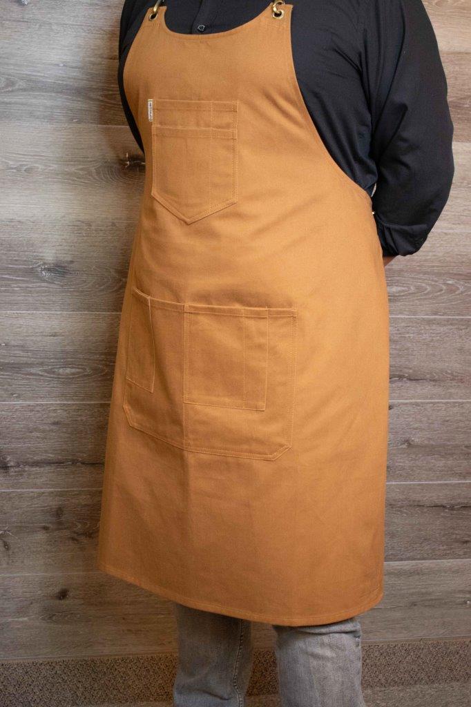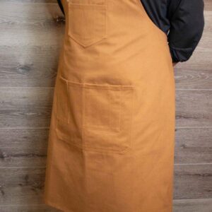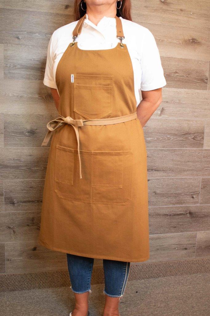 Return To ShopColonel Mustard Bib Apron is a rich Gold with Tan accent stitching, this 12-ounce brushed cotton blend that feels soft with stretch. The rich gold and antique metal sliders accent this apron design. Colonel Mustard won’t leave you in the library or hit you with a candlestick, with 11 pockets throughout is sure to make heads turn. Aside from looking good, it is an incredibly durable and useful bib apron with a centered, 4 split pocket on top, 7 waist pockets, including an iPhone friendly pocket.