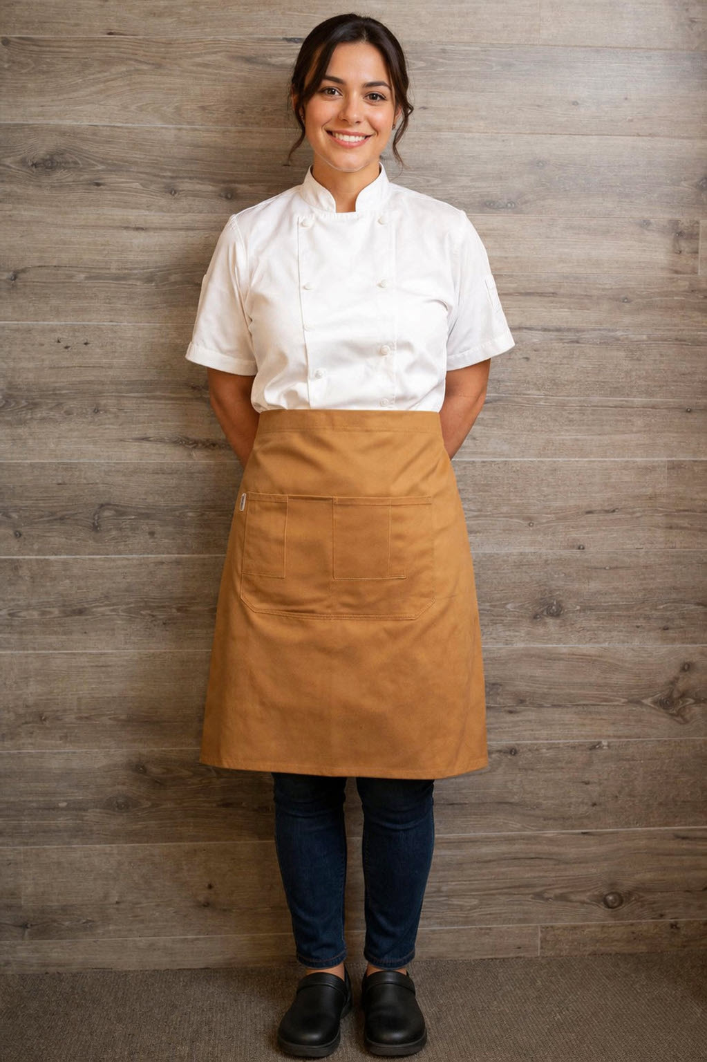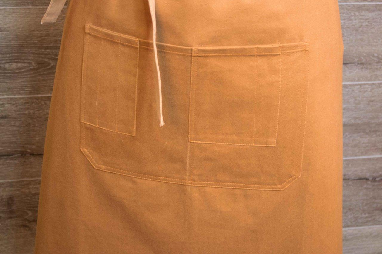 Return To ShopColonel Mustard Bistro is a rich Gold with Tan accent stitching, this 12-ounce brushed cotton blend that feels amazing and moves with you. The rich gold and antique metal sliders accent this apron, with 7 pockets throughout, Colonel Mustard won’t leave you in the library or hit you with a candlestick. Aside from looking good, it is an incredibly durable and useful bistro apron with 7 waist pockets, including an iPhone friendly pocket. Comes standard with tan 42” ties with antique brass hardware.
