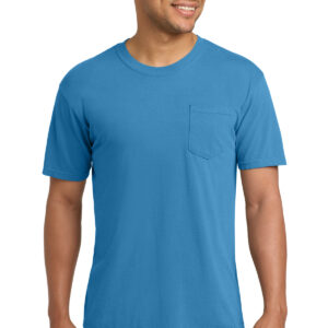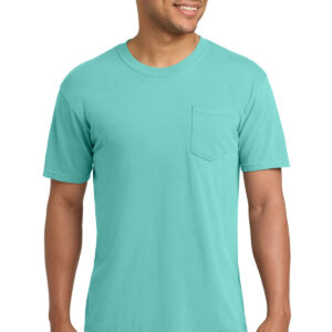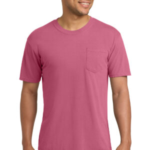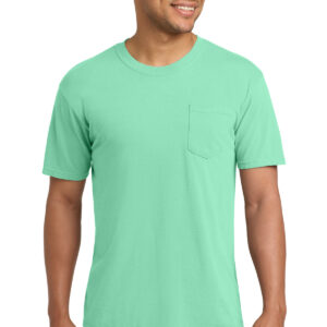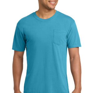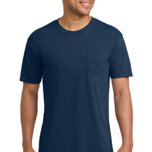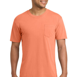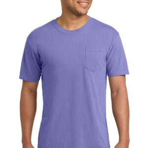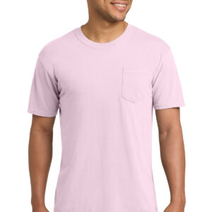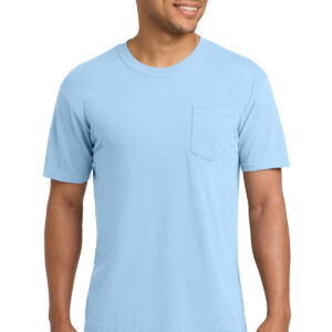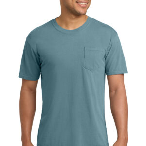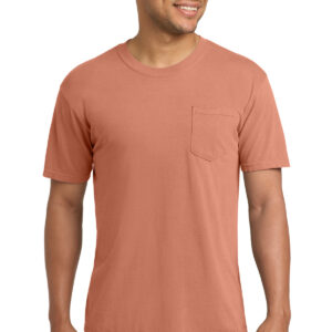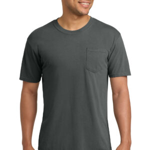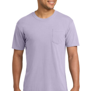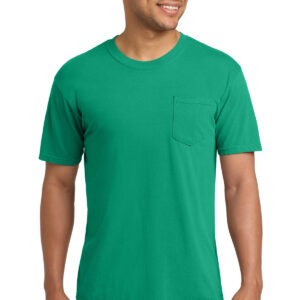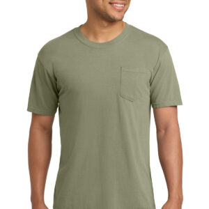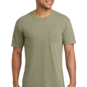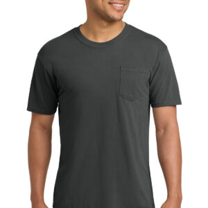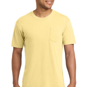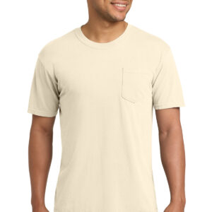 6.1-ounce, 100% US ring spun cotton Soft-washed, garment-dyed fabric Top-stitched, classic width rib collar Twill-taped neck and shoulders Twill label Left chest pocket Double-needle collar and bottom hems Relaxed fit, seamless body
