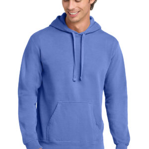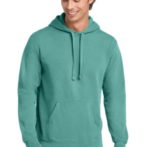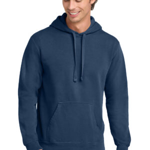 9.5-ounce, 80/20 ring spun cotton/poly Soft-washed, garment-dyed fabric Jersey-lined hood with drawcord Rolled forward shoulder Back patch Twill-taped back neck Twill label Side seamed Pouch pocket 1×1 rib knit on cuffs and hem Double-needle armholes, cuffs and hem