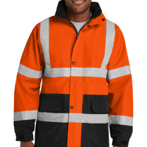 This seam-sealed parka locks out moisture while helping ensure your safety. | ANSI/ISEA 107 Class 3 certified 100% polyester shell and lining 8000MM fabric waterproof rating Fully waterproof and seam-sealed Two-way Vislon zipper Hideaway hood Storm flap with snap closure 2-in. wide reflective taping on front, back and sleeves Half-elastic adjustable tab cuffs with hook and loop closures Interior pocket with hook and loop closure Two large lower pockets Drawcord waist and hem with toggle adjustability Decoration access pocket This garment must be fully zipped to be in compliance with ANSI/ISEA 107 standards
