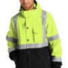 100% polyester 300-denier ripstop shell with durable water-repellent (DWR) finish 100% polyester lining Black bottom front and lower sleeves for a cleaner appearance Shell’s fabric waterproof rating: 5000MM Fully seam-sealed shell Adjustable rain hood Durable, reflective 2-inch tape meets ANSI 107 requirements Full-length interior and exterior storm flaps Vented cape back Right chest pocket and retractable ID holder Two lower front pockets Center front zippered pocket to hold a tablet Gusseted cuffs Elastic hem Decoration access pocket in shell Non-ANSI, 8.6-ounce, 100% polyester inner full-zip hoodie Hoodie can be attached inside shell This garment must be fully zipped to be in compliance with ANSI 107 standards