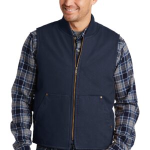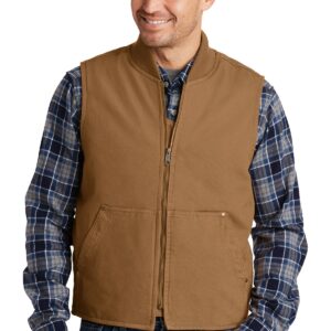 Rugged and ready to take on the toughest jobs, this warm, soft, layerable vest is enzyme-washed for a lived-in look and easy fit. The length allows tool-belt access, but is also ideal for everyday use. 12-ounce, 100% cotton enzyme-washed duck cloth 100% polyester taffeta lining quilted to 6-ounce, polyfill insulation Rib knit collar Metal rivets at crucial stress points Front hand warmer pockets Interior pocket with hook and loop closure Decoration access pocket