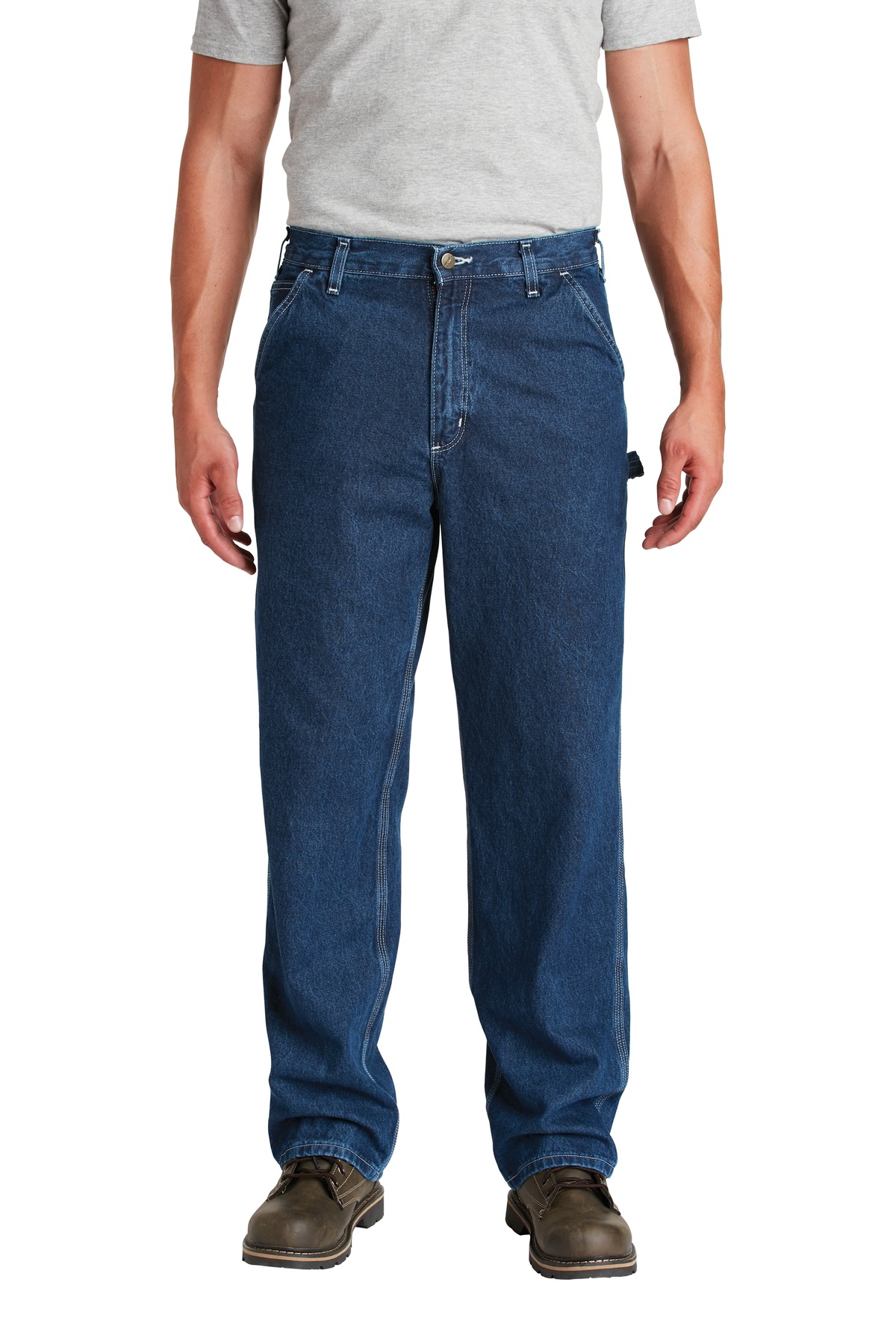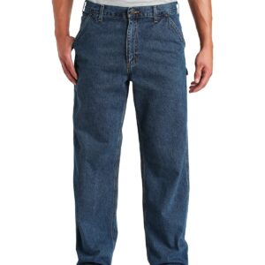 All the things you need in a work jean: toughness, utility and versatility. Cut for comfort for a long day on the job. 11.75-ounce, 100% cotton washed denim Sits slightly above the waist Generous fit through the seat and thigh with the most room to move Multiple tool and utility pockets Left-leg hammer loop Stronger sewn-on-seam belt loops Heavy hauling reinforced back pockets Straight leg opening fits over boots Carhartt leatherette label sewn on right rear pocket Loose fit