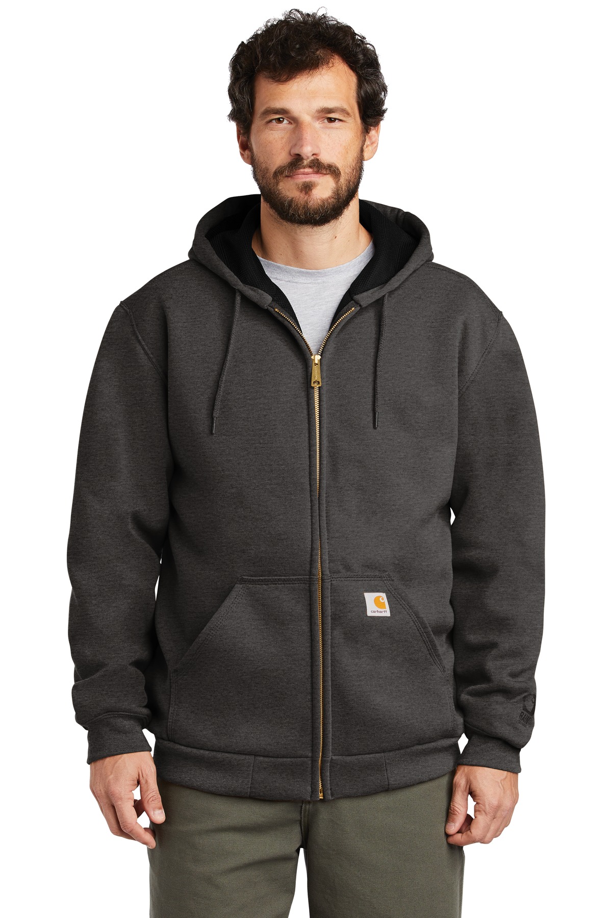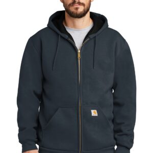 This rain-blocking hoodie is work-ready. It helps you stay warm and dry and makes water bead up and roll off with ease. 12-ounce, 50/50 cotton/poly blend with Rain Defender durable water-repellent finish 53/47 cotton/poly blend (Carbon Heather) 100% polyester thermal lining retains warmth Attached thermal-lined three-piece hood with drawcord closure Full-length brass front zipper Two front hand warmer pockets Stretchable, spandex-reinforced, rib knit cuffs and waistband Inside pocket with zipper closure Locker loop Carhartt label sewn on left hand warmer pocket
