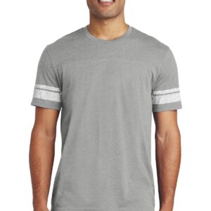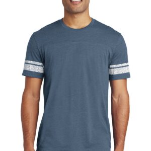This tee has a retro, game-day inspired look. 4.5-ounce, 60/40 combed ring spun cotton/poly, 32 singles 1×1 rib knit neck Tear-away label Distressed printed stripes at sleeve Front and back yoke Shoulder to shoulder taping