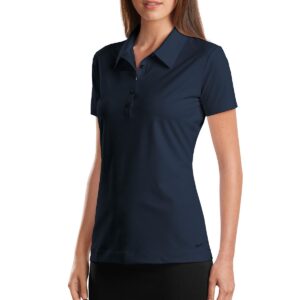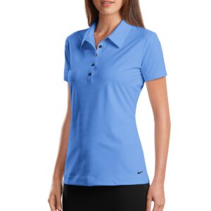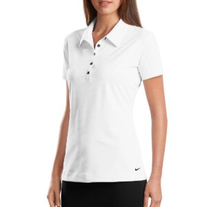 A beautiful and luxurious addition to any wardrobe. Subtle ottoman texture meets the unrivaled performance of Dri-FIT moisture management technology. Engineered with a bonded self-fabric collar for classic refinement. Five-button placket. Heat transfer label for tag free comfort. Pearlized buttons with metal rims. Open hem sleeves. Tailored for a feminine fit with an upper back pleat and contrast heat transfer Swoosh design trademark on the left hem. Made of 5.61-ounce, 87/13 polyester/spandex Dri-FIT fabric.