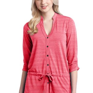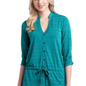 The cure-all for her tired wardrobe, this tunic features bias-cut details and a playful drawcord waist. | 4.3-ounce, 96/4 poly/spandex jersey with stay-cool wicking technology OGIO heat transfer label for tag-free comfort Self-fabric, bias-cut collar 6-button, bias-cut placket with O debossed metal buttons 3/4 sleeves with ruching Pleat at back yoke Self-fabric, bias-cut drawcord tunnel with dyed-to-match drawcord with metal tips Woven OGIO badge at hem