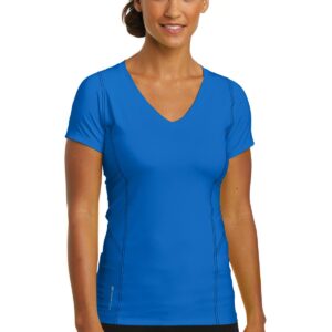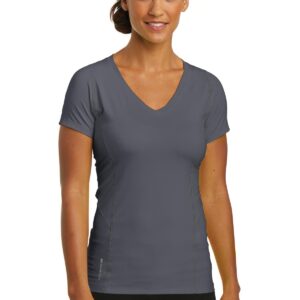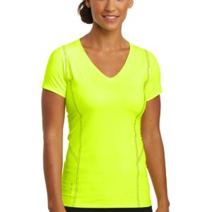 STAY-COOL WICKING ODOR CONTROL ZONED VENTILATION STRETCH FLATLOCK SEAMS FOR COMFORT REFLECTIVE DETAILS | 5.6-ounce, 88/12 poly/spandex jersey body 4.1-ounce, 92/8 poly/spandex mesh panels Reflective O heat transfer at back neck Reflective stacked O heat transfers at back OGIO heat transfer label for tag-free comfort Mesh at v-neck and center back Modified raglan sleeves Reflective O heat transfer at right hem