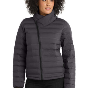 Welded baffles and non-traditional zippers give this street-ready puffy jacket a technical look and feel. 100% poly with stretch and durable water-repellent (DWR) finish 100% nylon lining Poly fill insulation Molded zippers Asymmetrical zipper Mitered OGIO back neck label OGIO rubber tab on left pocket Binding at cuffs Toggle at hem for adjustability