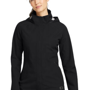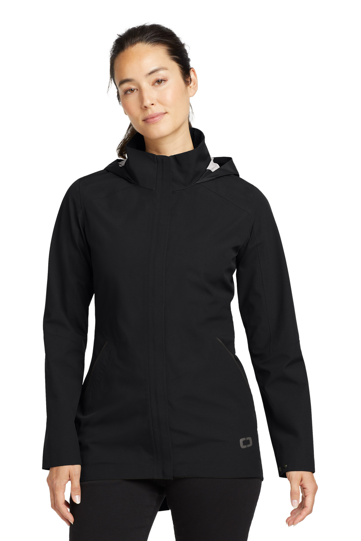 This parka-length, fully seam-sealed jacket is sleek, modern and can take on most forecasts with 5K/5K weather protection. | Durable water-repellent (DWR) 100% poly shell bonded to a water-resistant film insert 5000MM fabric waterproof rating 5000G/M2 fabric breathability rating Adjustable, packable hood Mitered OGIO back neck label Exterior storm flap Waterproof molded zippers Black reflective taping details Adjustable, snap-closure cuffs Interior waist drawcord with toggles for an adjustable, flattering fit Hidden zippered pockets with reflective zipper detail Back vent Black reflective O heat transfer on front left hem