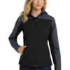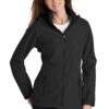 This feminine, water-resistant soft shell has interior elastic at the waist to flatter your shape. | 100% polyester woven shell bonded to a water-resistant film insert and a 100% polyester microfleece interior 100% polyester tricot-lined front zippered pockets 1000MM fabric waterproof rating 1000G/M2 fabric breathability rating Full-length interior storm flap Open cuffs and hem