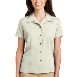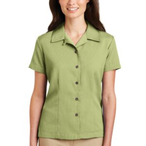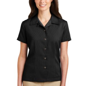 This classic camp shirt is perfect for upscale service environments. Made from no-fuss fabric, this shirt has faux coconut shell buttons and a stain-release finish that helps keep you clean and stain-free so it keeps its great looks wear after wear. | 5.75-ounce, 75/25 poly/rayon with stain-release finish Open collar Front and back darts Open hem
