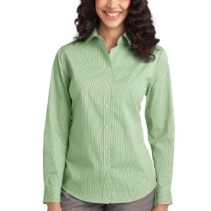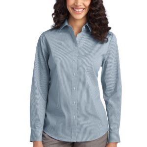 A fine stripe pattern and a stretchable blend make this modern poplin shirt a true workplace asset. Bias-cut details accentuate this always-professional look. | 3.4-ounce, 67/30/3 cotton/poly/spandex Gently contoured silhouette Open collar Bust darts Back princess seams Bias-cut details inside collar stand and under cuffs Adjustable, button-through sleeve plackets Shirttail hem