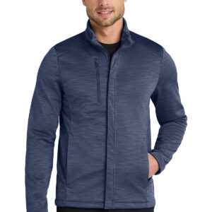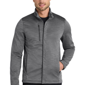 With a subtle striated pattern, this sleek soft shell hits the mark for corporate sophistication. It keeps water and wind at bay with a water-resistant film insert and a DWR finish. 100% polyester knit shell with DWR finish bonded to a water-resistant film insert and a 100% polyester microfleece lining 5000MM fabric waterproof rating 3000G/M2 fabric breathability rating Full-length exterior storm flap Reverse-coil zippers Zippered chest pocket Covered front zippered pockets Open hem with adjustable locking drawcord