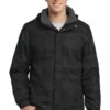 An understated vertical texture and bold colorblocking gives this durable, water-repellant soft shell a sporty look and feel. Ideal for moderate wind or rain, it has a warm poly microfleece interior and plenty of stretch for full range of motion. | 100% polyester knit shell bonded to a water-resistant laminated film insert and a 100% polyester fleece lining 1000MM fabric waterproof rating 1000G/M2 fabric breathability rating Contrast reverse coil zippers Full-length interior storm flap Zippered chest pocket Front zippered pockets Open cuffs Open hem