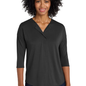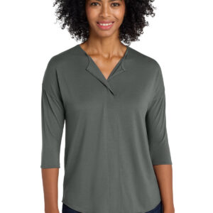 This contemporary top combines fabrics for work-to-weekend versatility. 4.4-ounce, 62/33/5 poly/rayon/spandex jersey knit (front and sleeves) 3.3-ounce, 69/31 rayon/poly woven (back) Split neck opening Slight drop shoulder Back seaming Side vents Drop tail hem