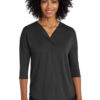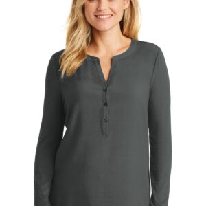 This soft, flowy tunic has professional edge with its woven front and knit back. 4.4-ounce, 62/33/5 poly/rayon/spandex jersey knit (sleeves and back) 3.3-ounce, 69/31 rayon/poly woven (front, back yoke and sleeve tabs) 3-button henley placket with dyed-to-match buttons Bust darts Inverted back pleats Roll sleeves with button tabs Longer tunic length Curved hem