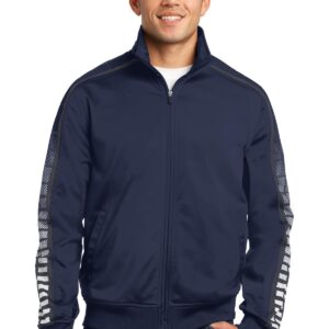 Stay on track in this comfortable track jacket that features piping and sublimated dot print sleeve panels for bold graphic interest. | 100% polyester tricot Soft-brushed backing Cadet collar Slash pockets Rib knit cuffs and hem Double stripe sleeve graphic