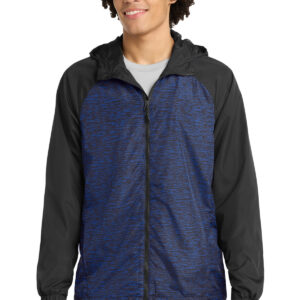 A heather print gives this water-resistant, wind-resistant jacket a sporty, energized look.| 100% polyester shell 100% polyester mesh body and hood lining 100% polyester woven sleeve lining Tag-free label Three-panel hood with drawcord and toggles Angled chin guard for additional comfort Exposed molded zipper Front slash pockets Half elastic, half self-fabric cuffs for comfort Decoration access pocket Slight drop tail hem Drawcord hem with toggles