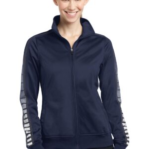 Stay on track in this comfortable track jacket that features piping and sublimated dot print sleeve panels for bold graphic interest. | 100% polyester tricot Soft-brushed backing Gently contoured silhouette Cadet collar Slash pockets Rib knit cuffs and hem Single stripe sleeve graphic