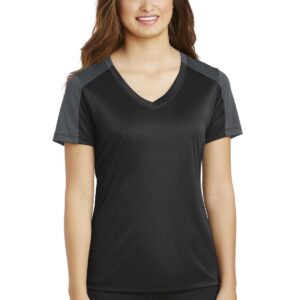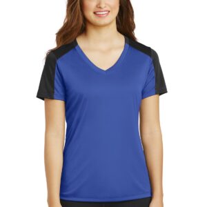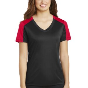 Contrast sleeve blocking enhances the athletic look of our colorfast, moisture-wicking, value-priced essential.| 3.8-ounce, 100% polyester interlock with PosiCharge technology Removable tag for comfort and relabeling Self-fabric V-neck Set-in sleeves