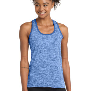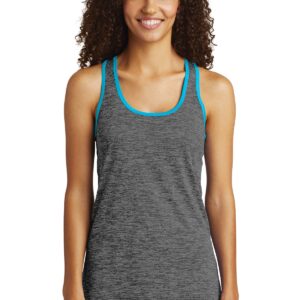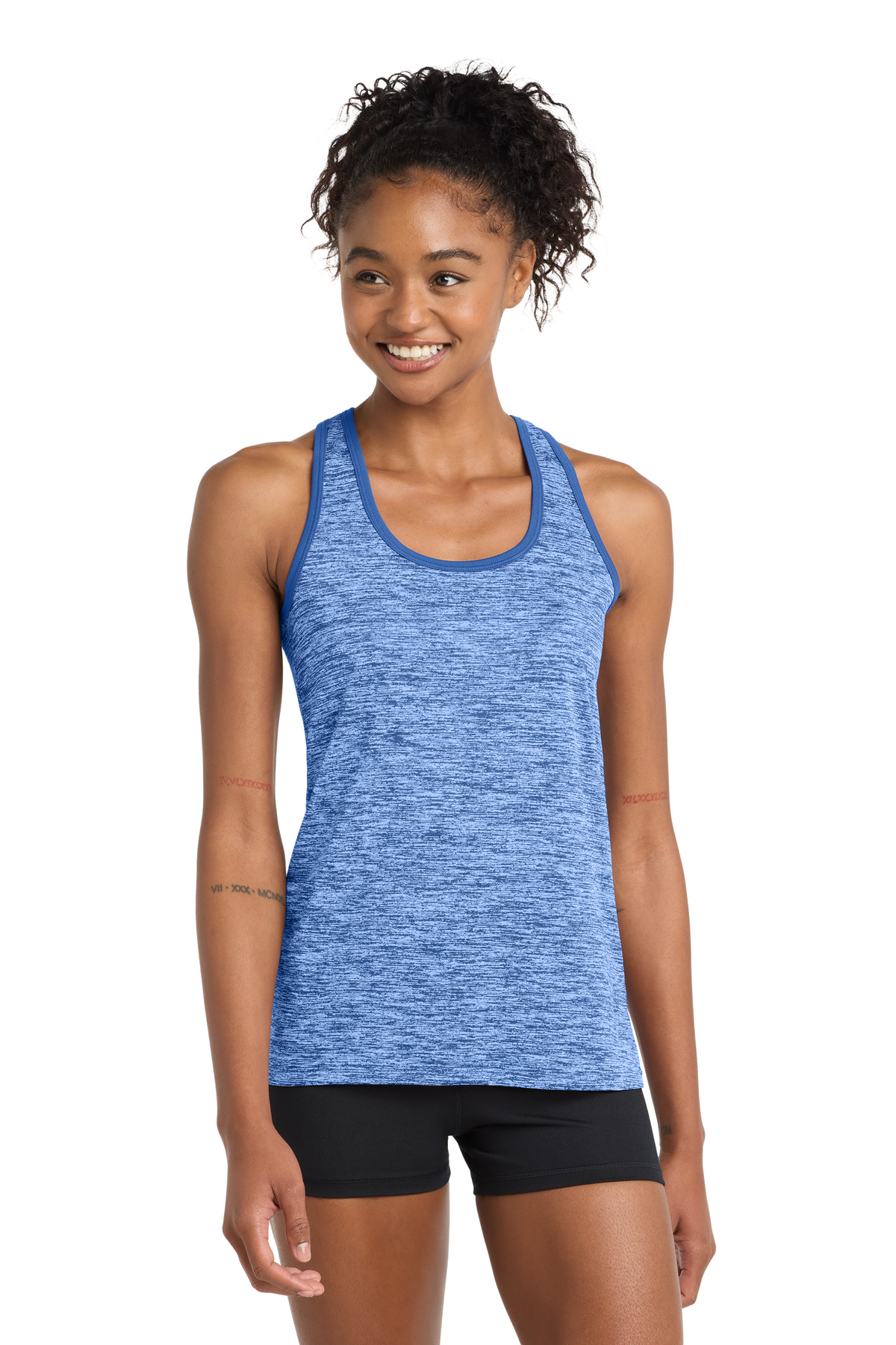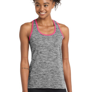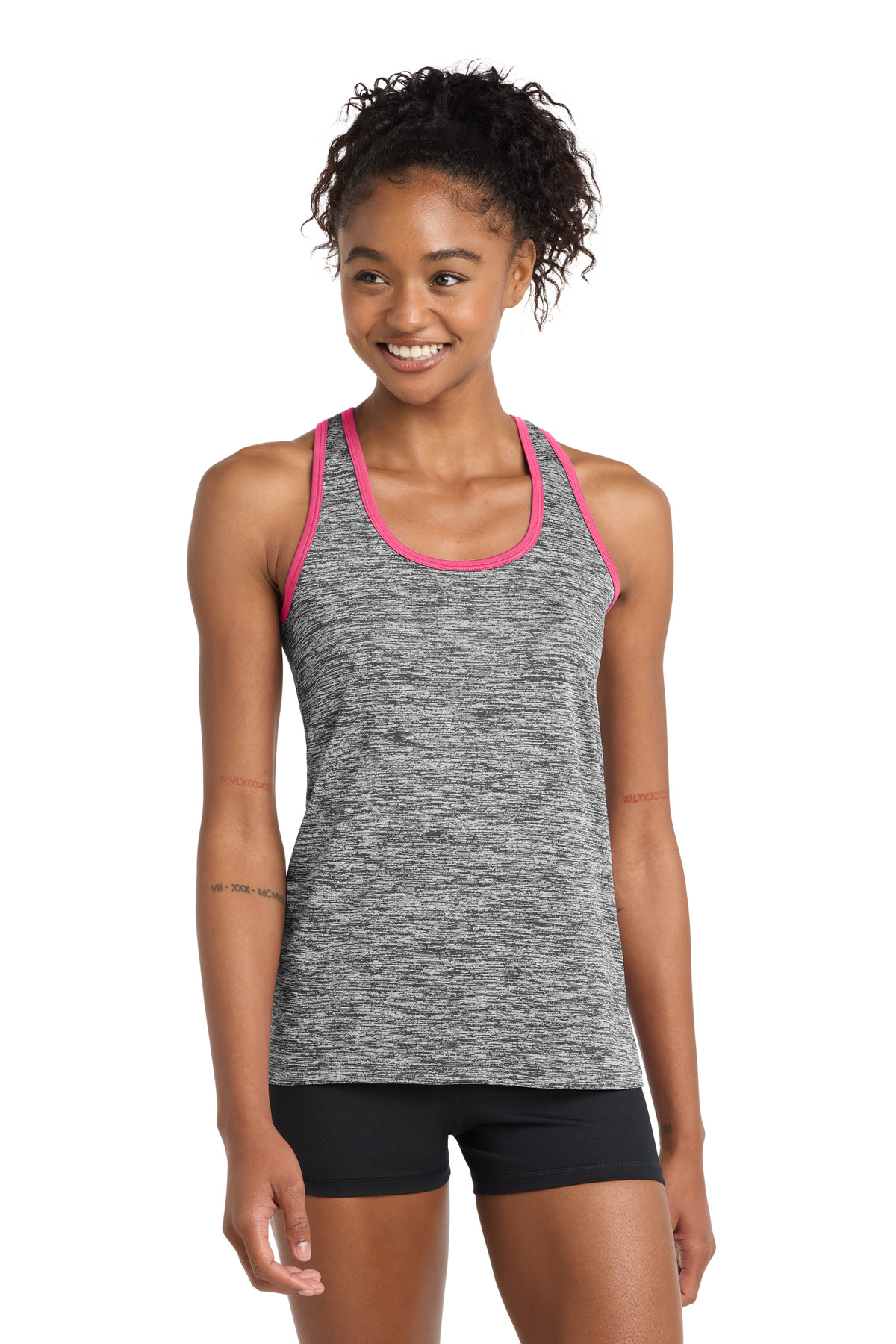 Our color-locking tank has a soft hand, wicks moisture, and combines colors and bindings at the neck and armholes. 4.1-ounce, 100% polyester jersey with PosiCharge technology (Electric Heather) 3.8-ounce, 100% polyester interlock with PosiCharge technology (trim) Removable tag for comfort and relabeling Curved drop tail hem