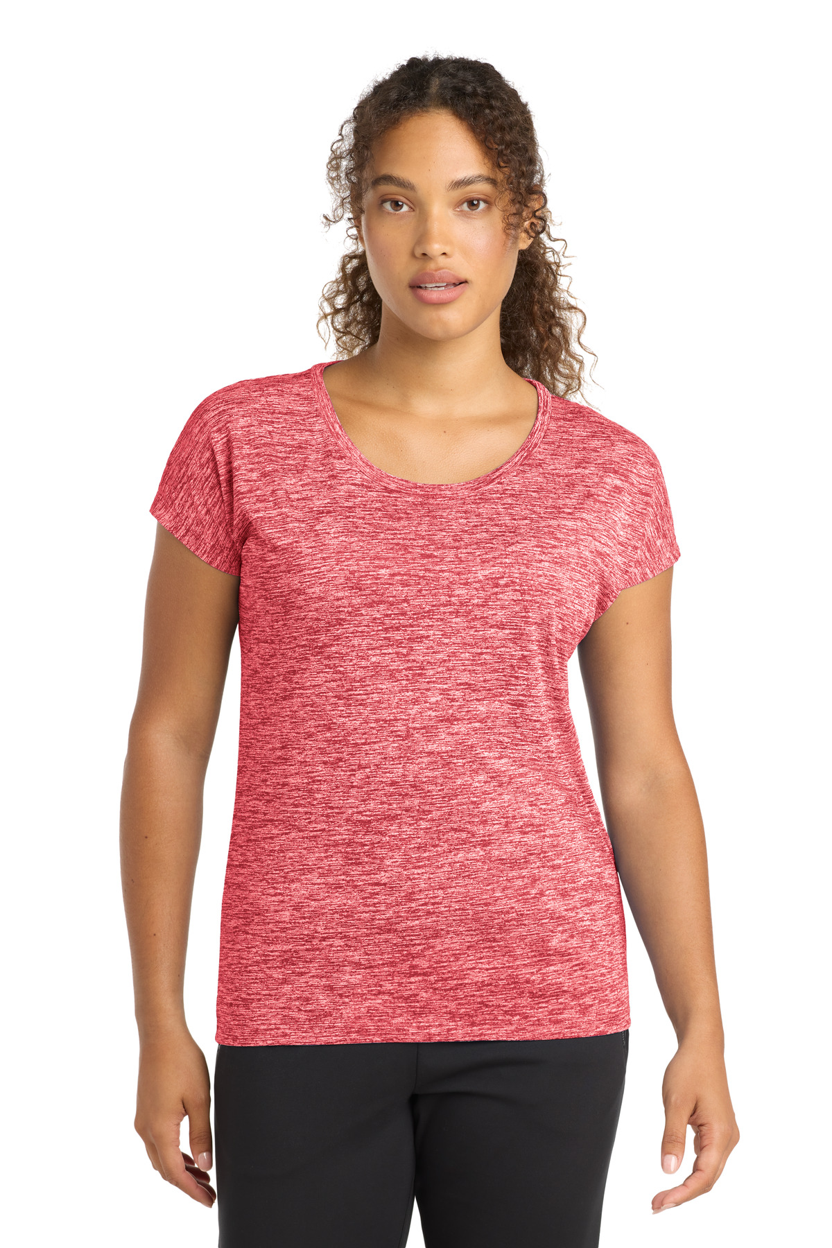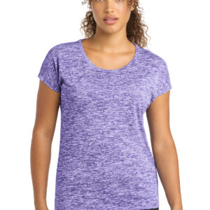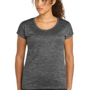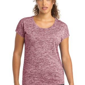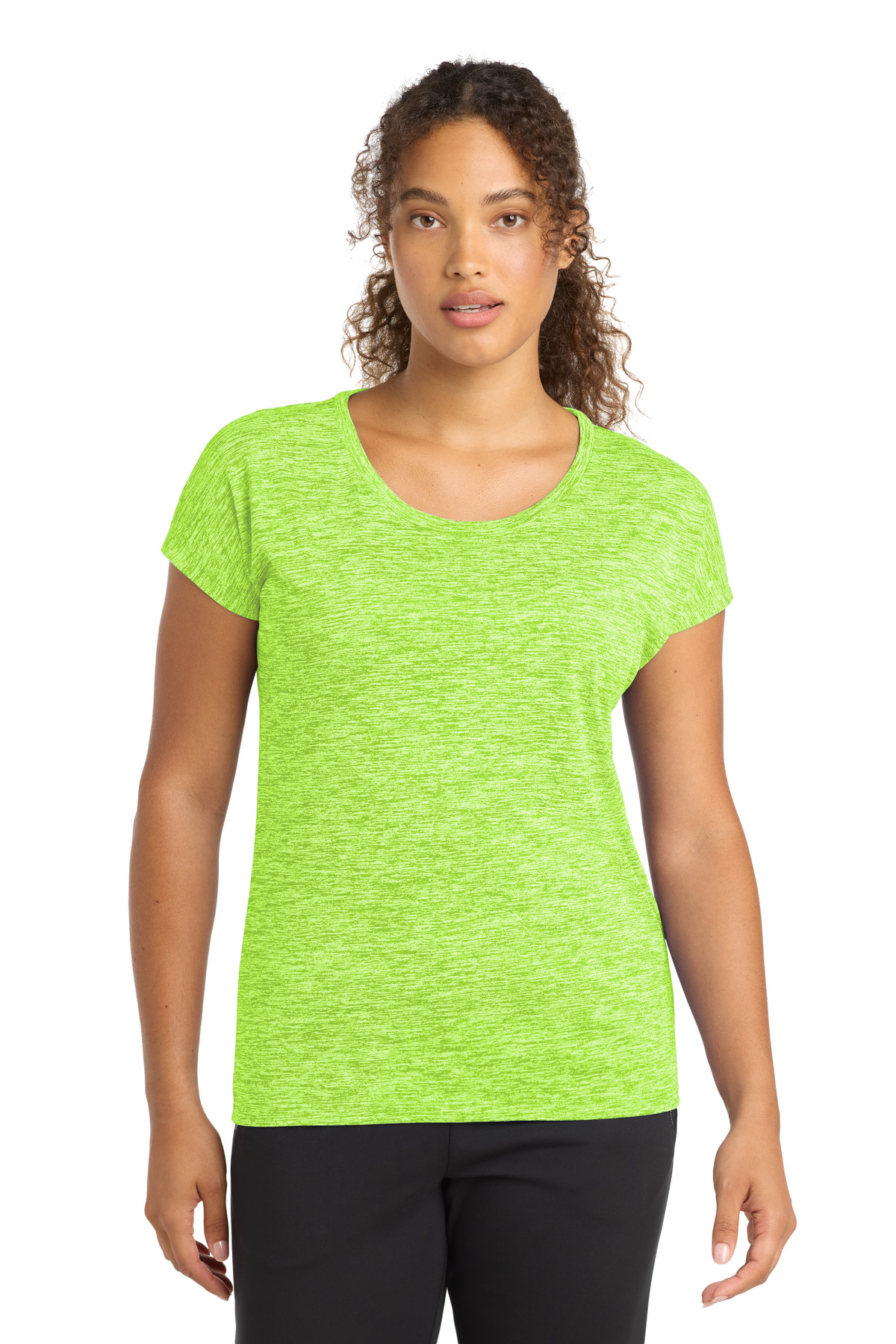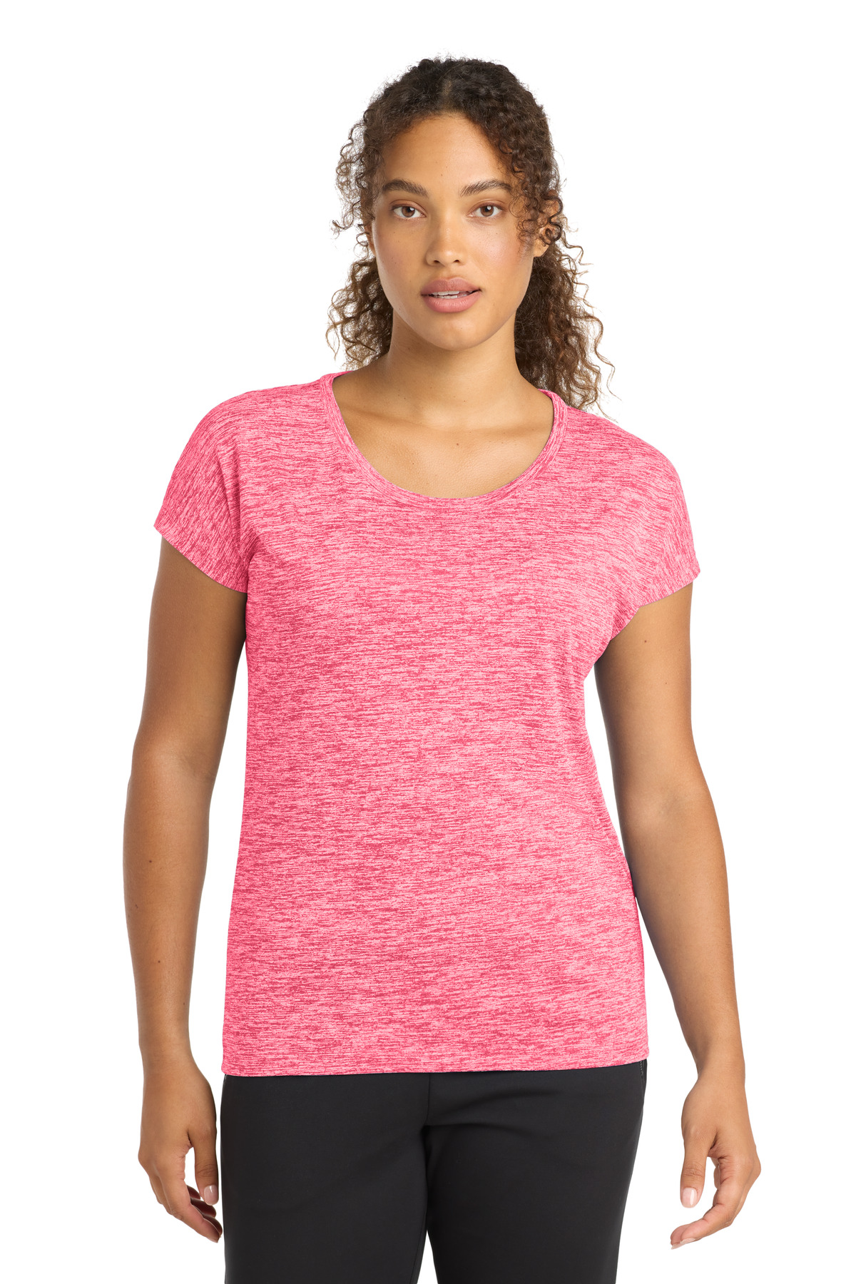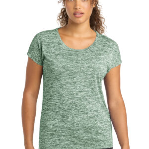 Our color-locking tee has a soft hand, wicks moisture and is energized with an allover heather pattern. 4.1-ounce, 100% polyester jersey with PosiCharge technology Removable tag for comfort and relabeling Scoop neck Dolman sleeves