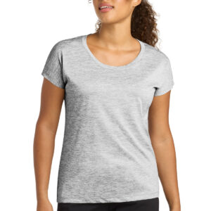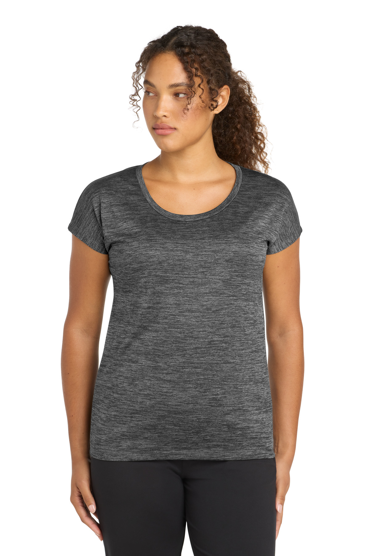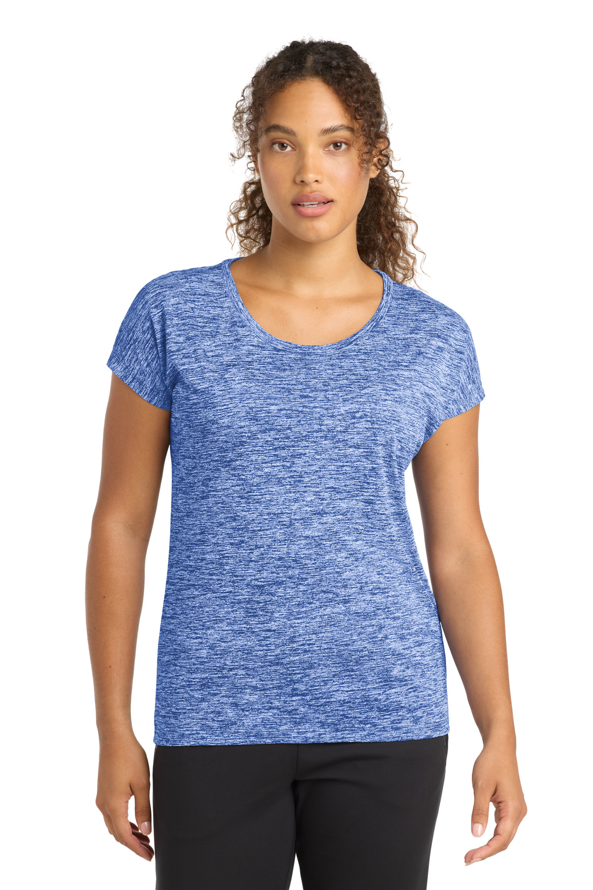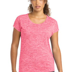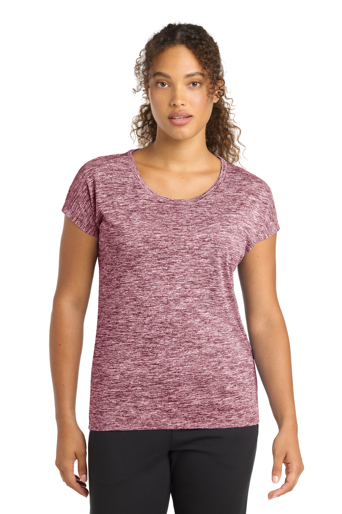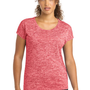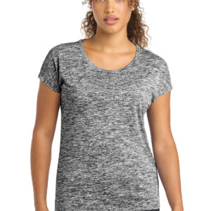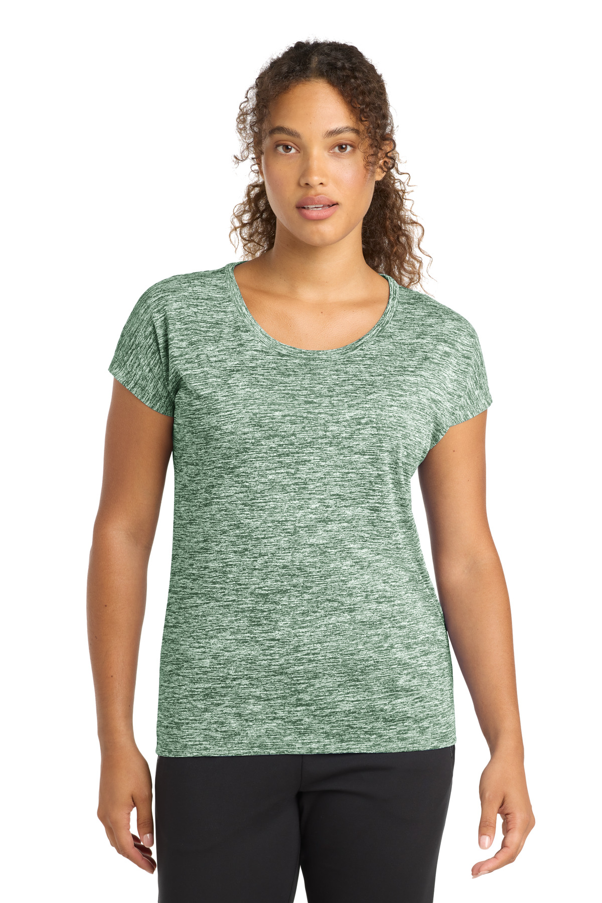 Our color-locking tee has a soft hand, wicks moisture and is energized with an allover heather pattern. 4.1-ounce, 100% polyester jersey with PosiCharge technology Removable tag for comfort and relabeling Scoop neck Dolman sleeves