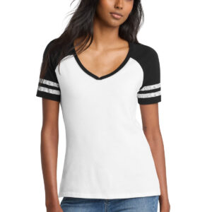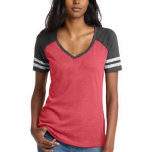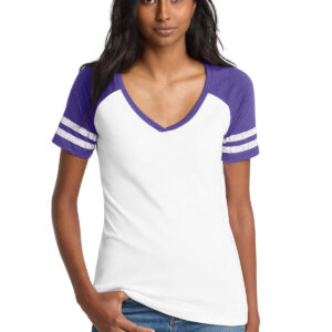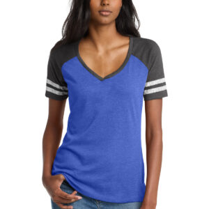 Feel like a winner in this comfortable tee. 4.6-ounce (155 GSM) 60/40 combed ring spun cotton/polyester, 32 singles Tear-away label Crossover V-neck Back neck tape Distressed printed stripes at sleeve