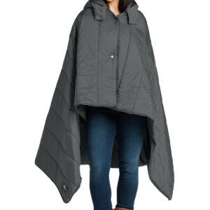 Is it a poncho or a blanket? It’s both! This versatile, packable poncho blanket is water-resistant and ready for adventures-both indoors and out. 100% polyester ripstop with durable water-repellent (DWR) finish 4.7-ounce, 100% polyester fill Detachable, zippered hood with visor Eddie Bauer logo snaps at hood and collar Elastic hand straps Attached, toggled cinch sack with contrast heat transfer Eddie Bauer logo Embroidery access pocket Woven Eddie Bauer logo patch label on lower right blanket corner Dimensions (excluding hood): 50′ x 70′