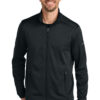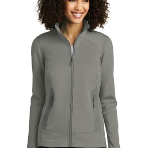 Made for movement, this sophisticated, stretch-infused twill fleece jacket has a smooth face and brushed fleece backing. Tonal welding details at the pockets and streamlined tailoring give it a refined look for indoor and outdoor uses. Beautifully shaped, feminine collar. Molded reverse coil zippers. Front zippered pockets. Contrast Eddie Bauer heat transfer logo on the right hem. Made of 8.3-ounce, 94/6 poly/spandex fleece with an anti-pill finish.