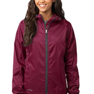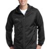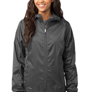 Wind was the inspiration for this compact layer.Plus, it packs down into its own logoed pocket, making it easy to carry wherever you go. Hood with locking drawcords for adjustability, contrast reverse coil zipper, underarm vents, front zippered pockets with packable right pocket, elastic cuffs and an open hem. Contrast Eddie Bauer logo on right hem. Made of 100% nylon.