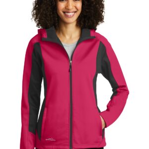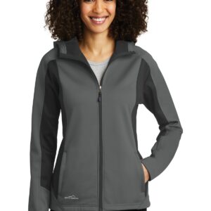 With 3K/3K waterproof and breathability fabric ratings, this knit soft shell has stretch for ease of movement and transitions from the workday streets to the weekend trails-regardless of the forecast. Exclusive StormRepel ® durable water-repellent (DWR) technology keeps you warmer and drier. Attached hood and princess seams. Front tricot-lined zippered pockets, reverse coil zippers, open cuffs and open hem. Decoration access pocket. Reflective Eddie Bauer logo heat transfer on right hem. Made of 100% polyester knit shell with DWR coating bonded to a water-resistant laminated film insert. 100% polyester brushed microfleece interior.