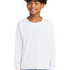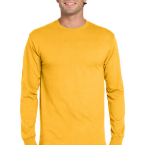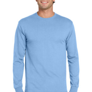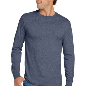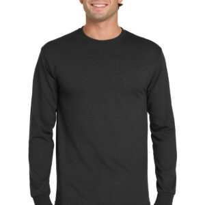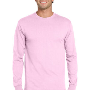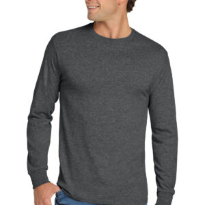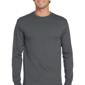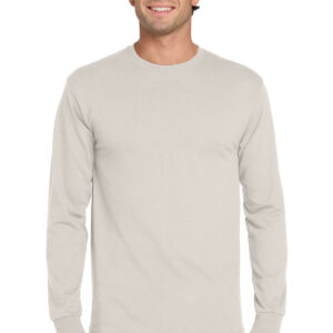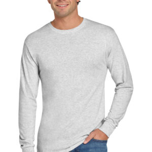 | 5.4-ounce, 50/50 cotton/poly jersey 47/53 cotton/poly (Oxford) Moisture-wicking Tear-away label Double-needle coverstitching on front neck Seamless 1×1 rib knit collar Shoulder-to-shoulder taping Rib knit cuffs Double-needle hem Ash (formerly Birch)