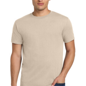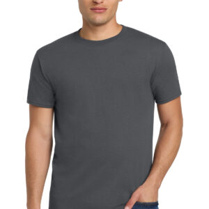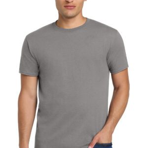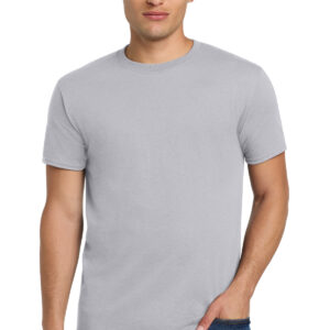 5.4-ounce, 50/50 cotton/poly 47/53 cotton/poly (Oxford) Advanced moisture management performance Tear-away label 1×1 rib collar with clean neckline Double-needle coverstitching on front neck Shoulder-to-shoulder taping Double-needle sleeves and hem Ash (formerly Birch)