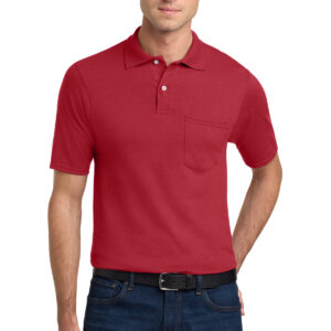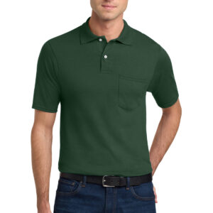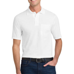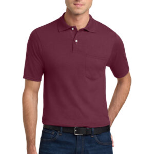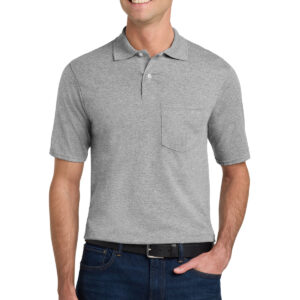 | 5.4-ounce, 50/50 cotton/poly preshrunk jersey Oxford is 47/53 cotton/poly Moisture-wicking for all day comfort Made with sustainably sourced, USA-grown cotton Tear-away label Welt knit collar that resists curling 5-point left chest pocket 2-button placket with bottom box stitch Pearlized buttons with durable cross-stitching Double-needle sleeves and hem Ash (formerly Birch)