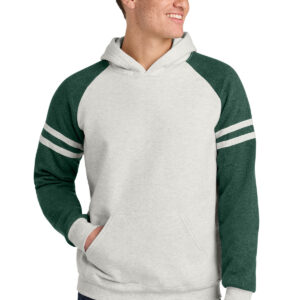 8-ounce, 50/50 cotton/polyester NuBlend ® pill-resistant fleece Made with sustainably sourced USA-grown cotton High stitch density for a smooth printing surface Jersey-lined hood No drawcord in hood Contrast raglan sleeves Athletic-inspired varsity stripes on sleeves Front pouch pocket 1×1 rib knit cuffs and hem Double-needle coverstitching on armholes and hem Tear-away label
