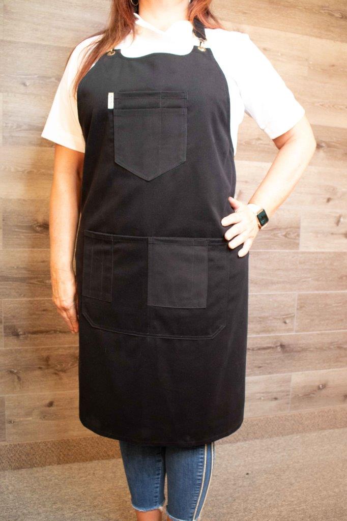 Comes standard with Black crisscross twill removable straps with antique brass hardware. For a custom look, you can add two 30” adjustable leather strap to customize this apron to any décor.